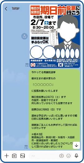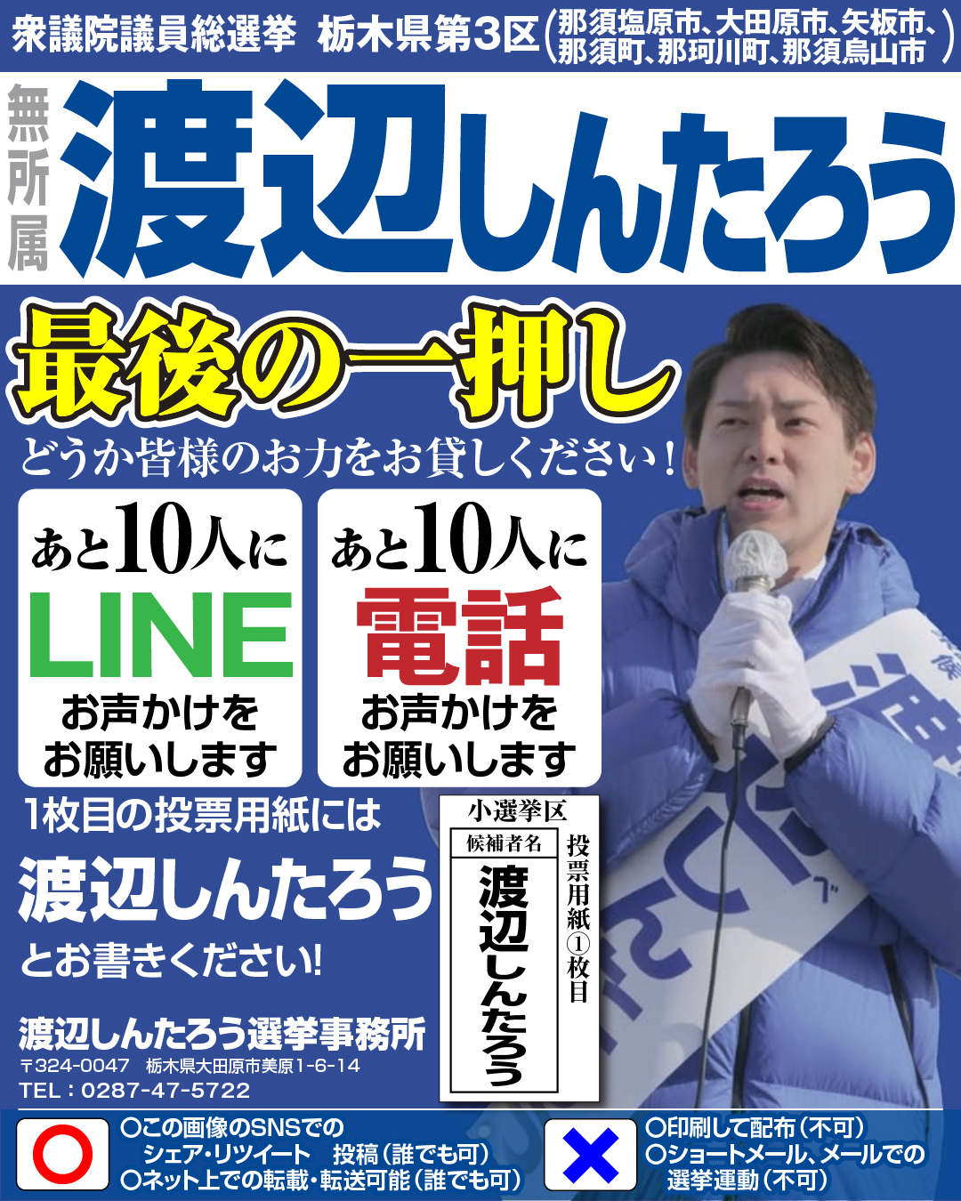 選挙期間中も「LINE」「インスタグラム」などSNSを使った支援拡大運動が可能です。 SNSを利用して、支援の輪を広げて頂きますようお願いいたします。 下記バナーをスマホに保存する。 (画像の顔の辺りを長押しで保存できます) 下記テキストをコピーする。 今やってる衆議院選挙 栃木生まれ栃木育ちの 『 渡辺しんたろう 』 に投票お願いいたします 期日前投票は2月7日(土)まで 市役所・役場でできます 何も持っていかなくても投票できます 投票日は2月8日(日)です 週末は予定がいっぱいだと思いますので期日前に投票お願いいたします 御家族ご友人にもお声がけして頂ければありがたいです ※栃木3区 那須塩原市 大田原市 矢板市 那須町 那珂川町 那須烏山市 にお知り合いがいましたらコピペして転送して頂ければありがたいです ■期日前投票所一覧 https://shintaro-w.jp/polling_station/ 下記で公式LINEの登録もお願いしたいです https://linevoom.line.me/user/_dSMTbz3huh7xdm-wPIIQFDYSgdUctyC7e9yVjmE テキストをコピー バナーとテキストをお友だちに送りまくってください!!